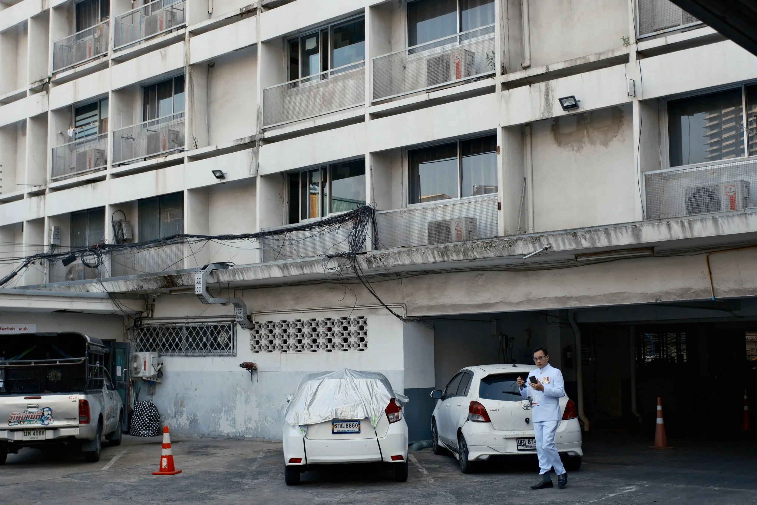 A moment of pause beneath ageing balconies and exposed electrical lines.